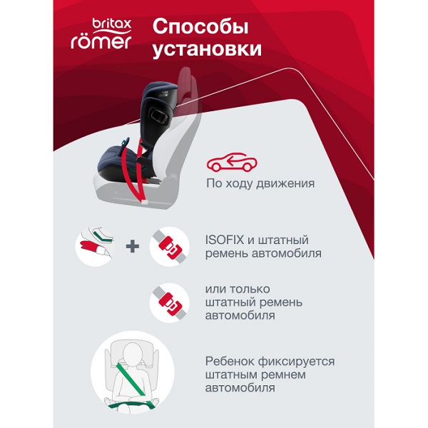 - Установка в автомобиле с помощью штатного ремня и системы Isofix или только с помощью штатного ремня автомобиля