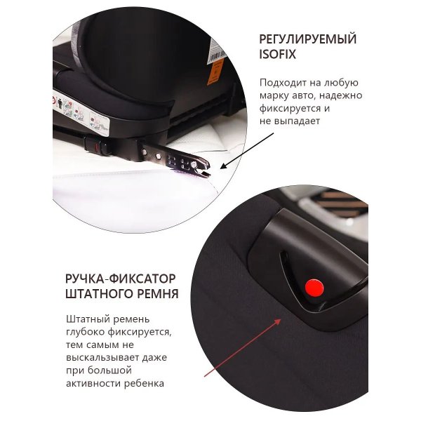 - Регулируемые по длине направляющие Isofix. Если направляющие Isofix не используются, они полностью задвигаются в корпус, не повреждаю обивку сиденья автомобиля.