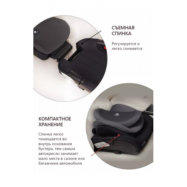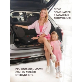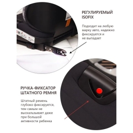 - Способ фиксации ребенка: штатный ремень автомобиля. Если рост ребёнка ниже 125 см, нужно использовать ремень-натяжитель, который идет в комплекте и легко регулируется по высоте спинки ребенка. Если ремень не используется, его удобно хранить в специальном отсеке.