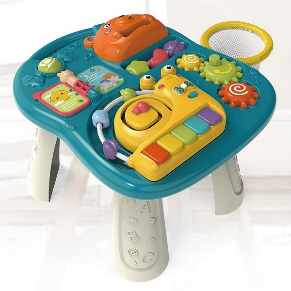 Оснащена различными музыкальными и увлекательными, разноцветными элементами, такими как: шестеренки, музыкальное пианино, книжка, бусинки на стержне, небольшое кольцо с сеточкой и погремушки-мячики.