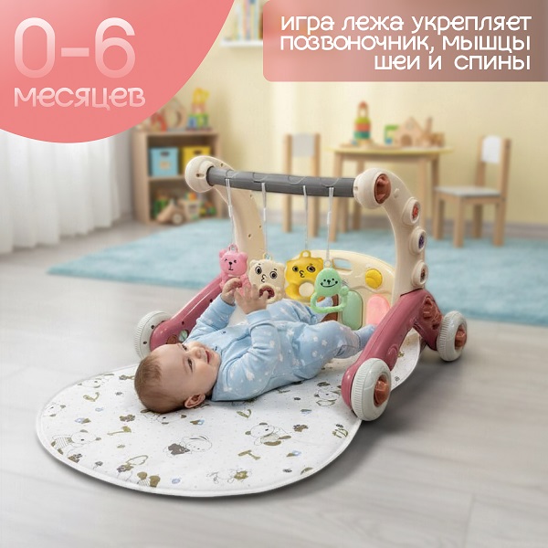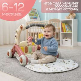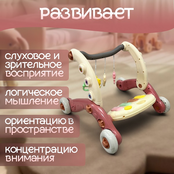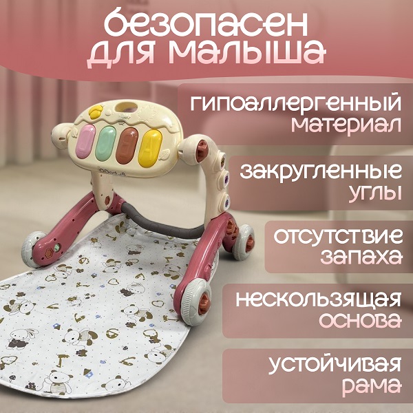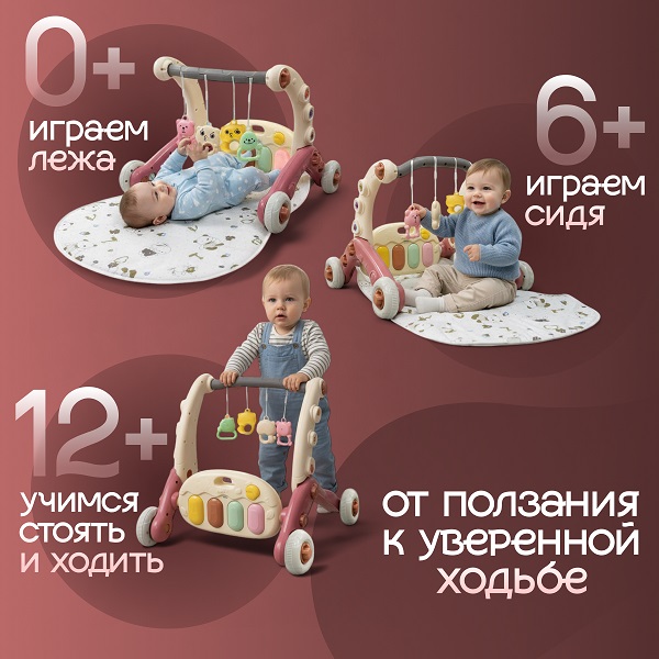 В одном устройстве объединены: устойчивые ходунки, съёмная музыкальная панель, мягкий коврик и подвесные игрушки.