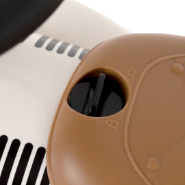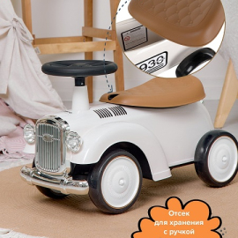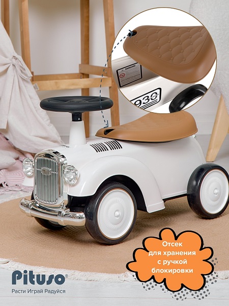 Машина каталка весит всего 2,3 килограмма, и ее легко можно взять с собой на прогулку. Удобное пластиковое сиденье, под сиденьем отсек для хранения. Чтобы открыть отсек для хранения, нужно повернуть ручку блокировки.