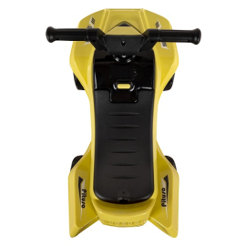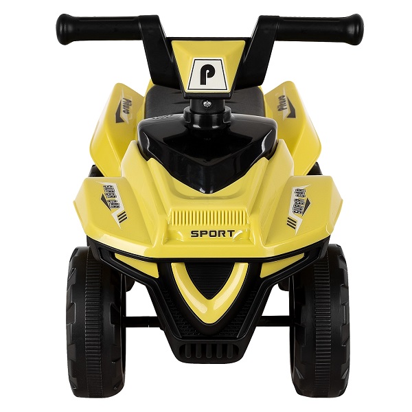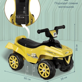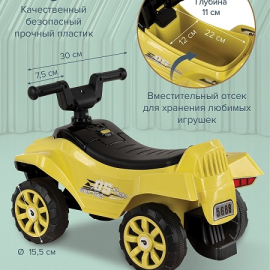 Модель выполнена в форме квадроцикла, имеет большие колеса с рисунком на шинах и просторное сиденье для комфортной посадки.