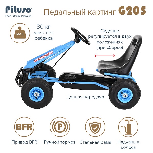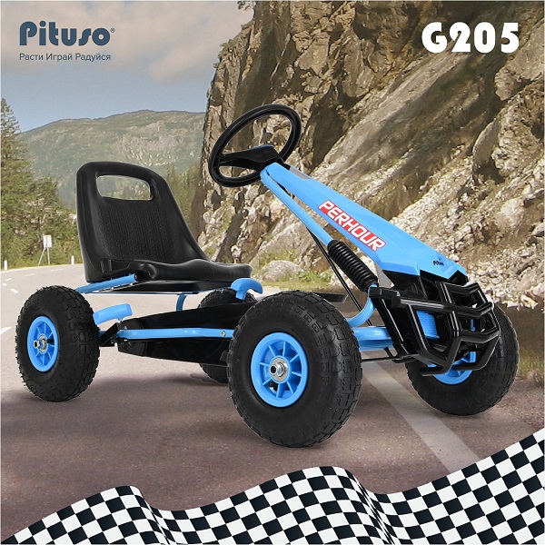 Педальный картинг PITUSO G205- это прекрасное сочетание велосипеда и автомобиля. Машинка приводится в движение вращением педалей, может ездить вперед и назад. Достаточно устойчив, чтобы не опрокинуться на повороте. Современный спортивный внешний вид. Картинг вырабатывает у ребенка навыки вождения.