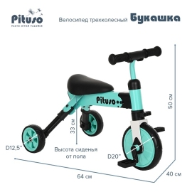 - Переднее колесо D20см, задние колеса D12,5см, высота сиденья от пола 33см