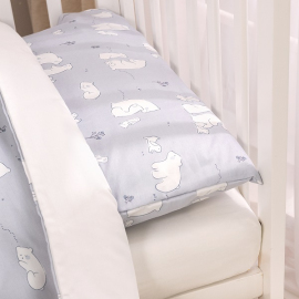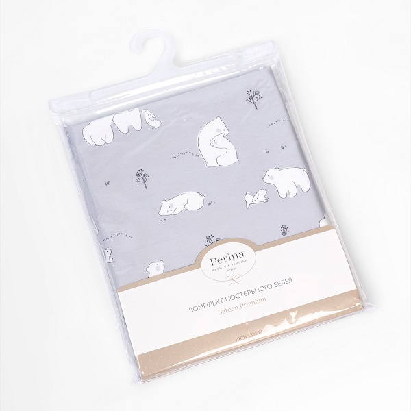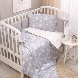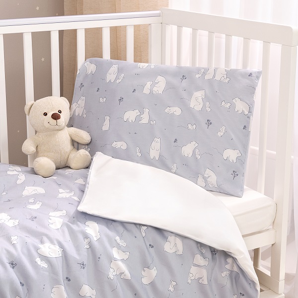 Комплект разработан для стандартных кроваток со спальным местом 120×60 см и включает 3 предмета: простыню на резинке, наволочку и пододеяльник на молнии.