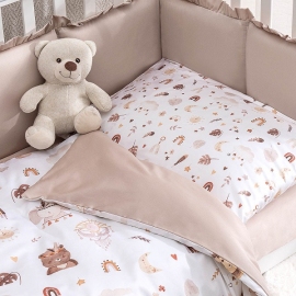 Дизайнерский принт украсит комнату, при этом не помешает малышу заснуть — цвета в узоре спокойные, натуральных оттенков. А милых акварельных персонажей будет интересно рассматривать после пробуждения. Кстати, пододеяльник двусторонний и выгодно сочетается и с наволочкой, и с однотонной простыней.