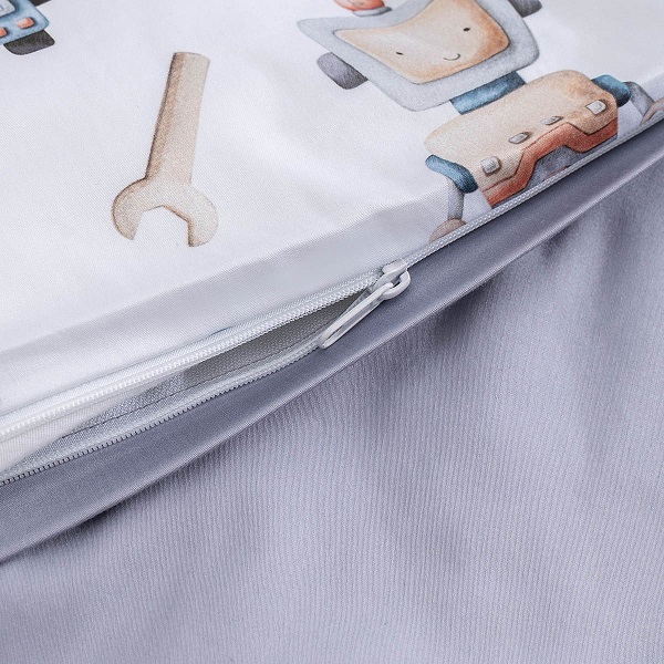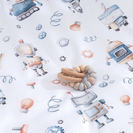 Дизайнерский принт с роботами украсит комнату, при этом не помешает малышу заснуть — цвета в узоре спокойные, натуральных оттенков. А милых акварельных роботов будет интересно рассматривать после пробуждения. Кстати, пододеяльник двусторонний и выгодно сочетается и с наволочкой, и с однотонной простыней.