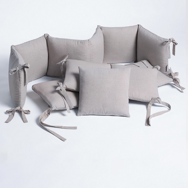 Для удобства использования бортики состоят из 4-х частей: полуборт из 6-ти подушечек, одна отдельная и по одной части из 2-х и 3-х подушечек. Элементы крепятся к кроватке завязками. Вы можете ставить в кроватку столько частей, сколько захотите, а отдельную подушечку можно использовать не только как защиту, но и как отдельный элемент.