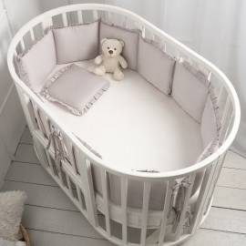 Модель подойдет как в прямоугольную, так и в овальную/круглую кроватку. Съемный чехол на молнии упрощает уход за бампером. Каждую подушечку можно достать из чехла по-отдельности. Вы можете постирать чехол, пока наполнители проветриваются (избегая попадания солнечных лучей).