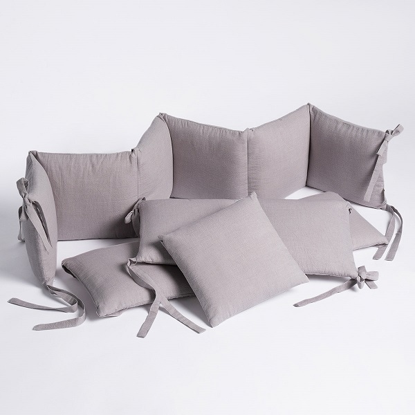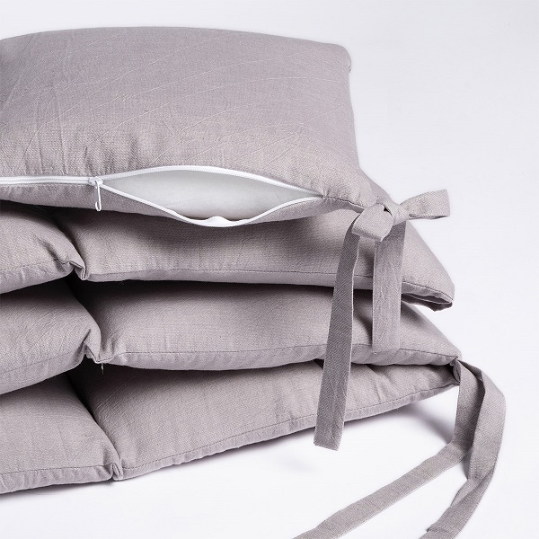 Для удобства использования бортики состоят из 4-х частей: полуборт из 6-ти подушечек, одна отдельная и по одной части из 2-х и 3-х подушечек. Элементы крепятся к кроватке завязками. Вы можете ставить в кроватку столько частей, сколько захотите, а отдельную подушечку можно использовать не только как защиту, но и как отдельный элемент.