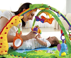 Игровые можно расположить на полу – это обеспечит безопасность игр. Ребенка, не умеющего сидеть, можно положить на живот или на спину, детей постарше – посадить. По углам устанавливаются специальные дуги, на которые подвешиваются игрушки, развивающие зрение, слух, моторику.