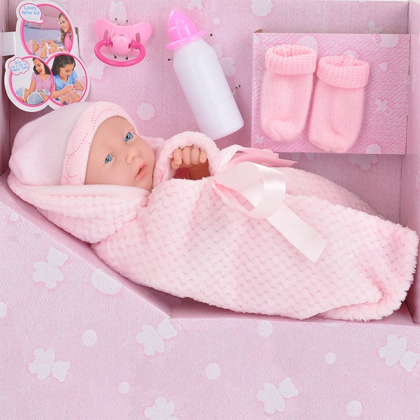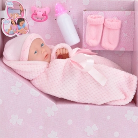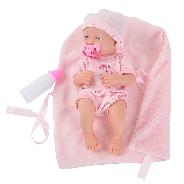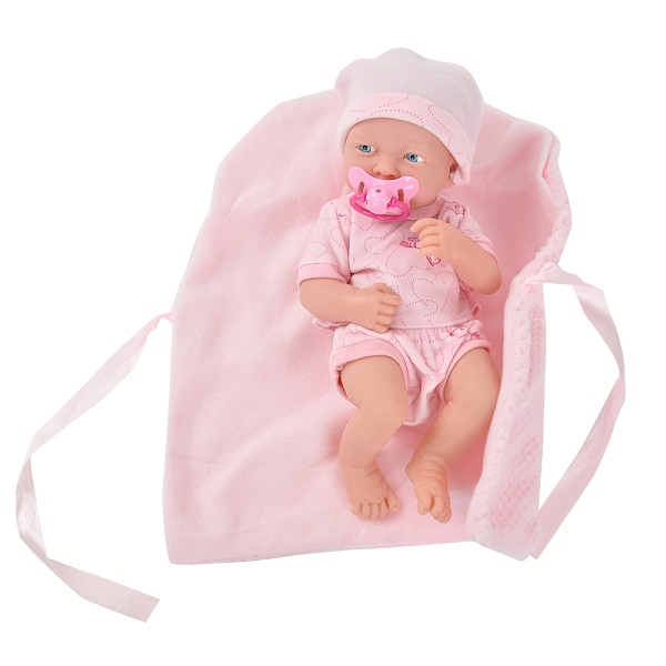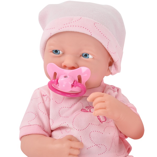 - В комплекте: Пупс в боди и шапочке- 1 шт., одеяльце – 1 шт., бутылочка-1шт., пустышка - 1 шт, носочки – 1 пара.