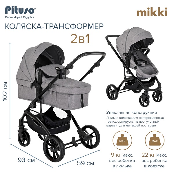Коляска-трансформер Mikki подходит для малышей с рождения. Всего один блок имеет два варианта трансформации: уютная люлька для новорождённого и прогулочный вариант для ребёнка постарше.