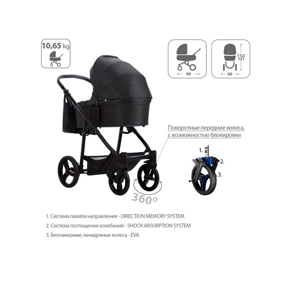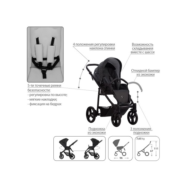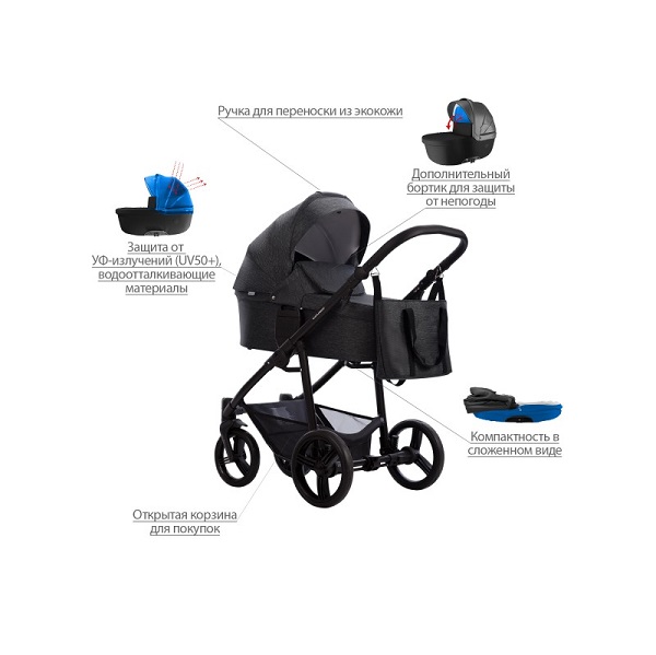 - Обивка коляски: водоотталкивающая, съемная, с УФ-защитой 50+.