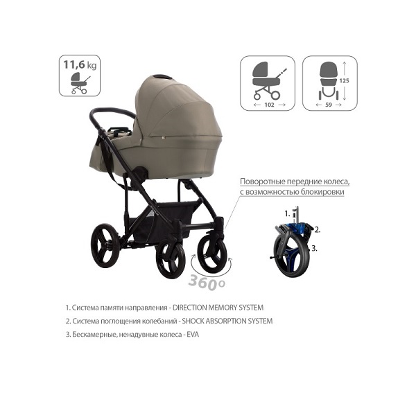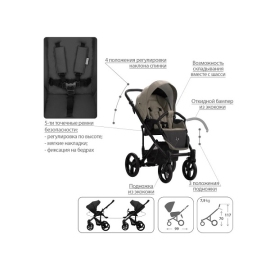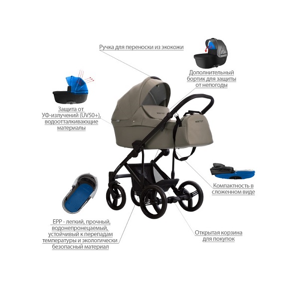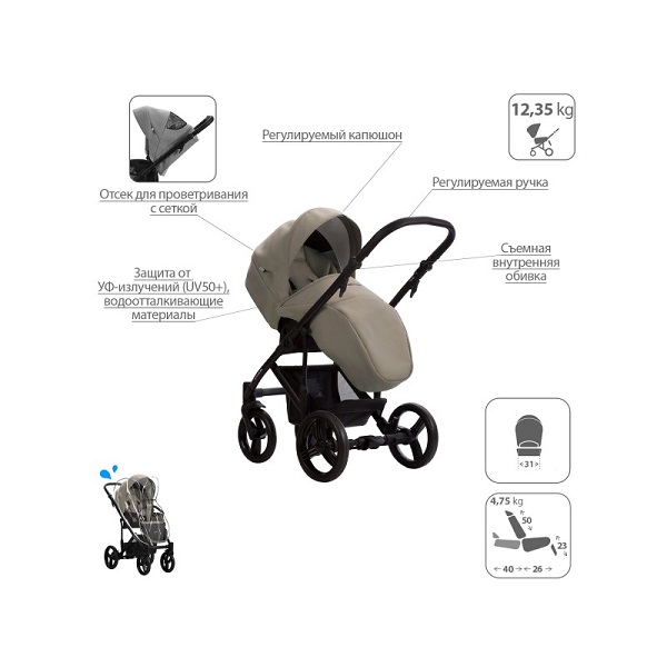 - Обивка коляски: водоотталкивающая, съемная, с УФ-защитой 50+.