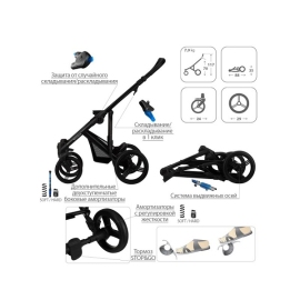 - Передние колеса поворотные, с возможностью блокировки, оснащены системами: SAS (поглощение колебаний) и DMS (память направления).
