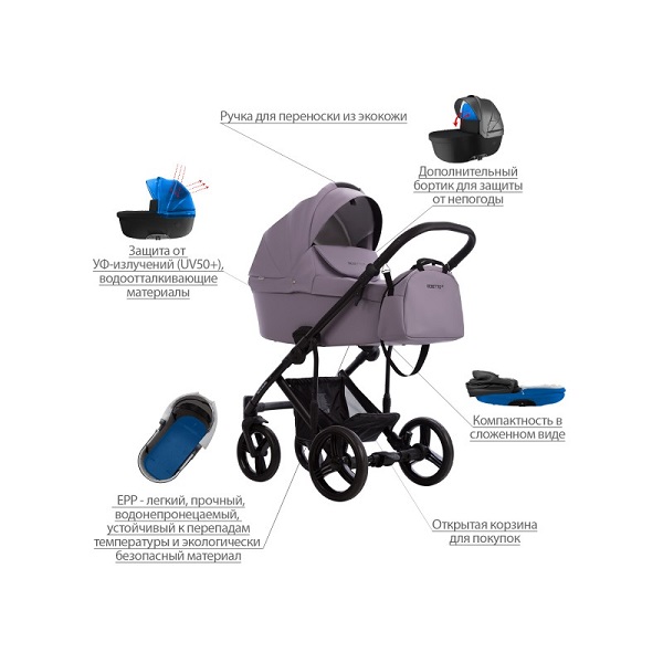 - Обивка коляски: водоотталкивающая, съемная, с УФ-защитой 50+.