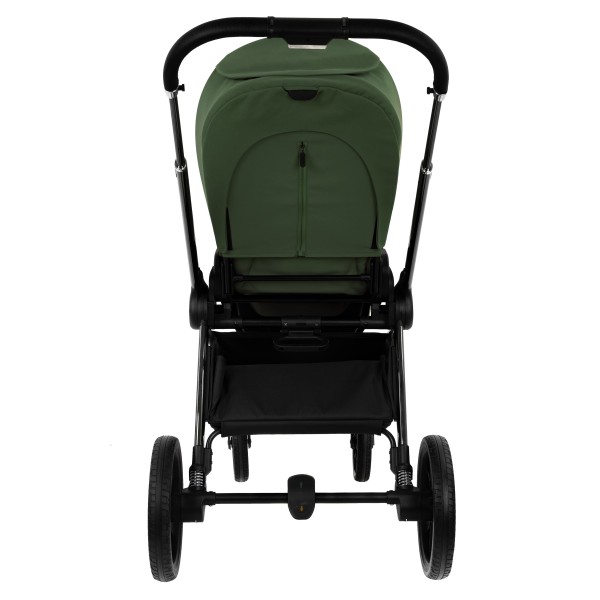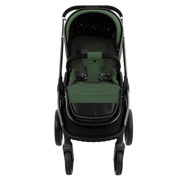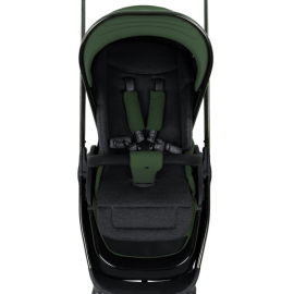 - Рама из облегченного алюминия с покрытием Black Chrome имеет повышенную износостойкость и компактно складывается по типу "книжки" вместе с прогулочным блоком.
