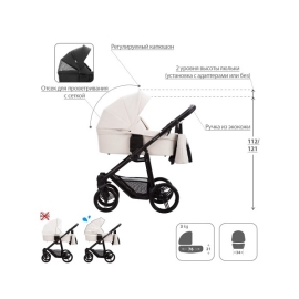 Конструкция данной коляски позволяет устанавливать на нее люльку, сиденье прогулочного блока или автомобильное кресло. Люлька и прогулочный блок реверсивные, их можно устанавливать как «лицом к маме», так и «лицом от мамы». Спальный вариант коляски предназначен для детей в возрасте от 0 до 7 месяцев (весом до 9 кг), прогулочный блок рассчитан на возраст от 7 месяцев до 3 лет (вес ребенка до 15 кг).