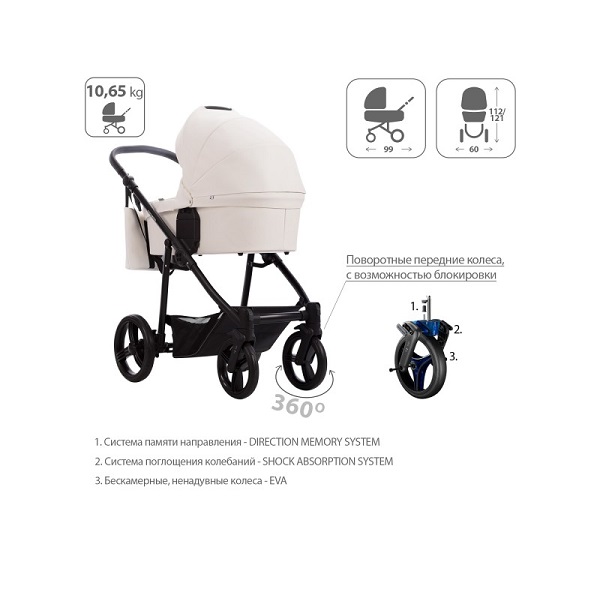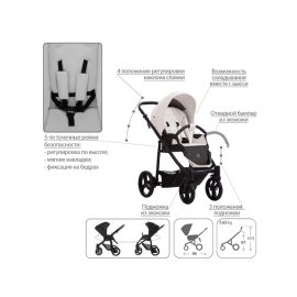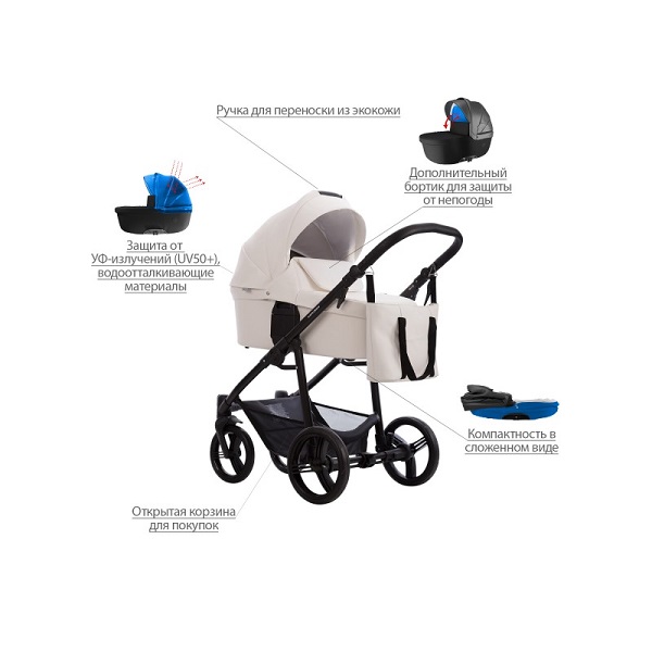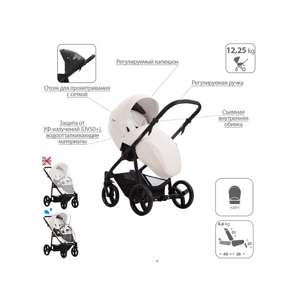 - Обивка коляски: водоотталкивающая, съемная, с УФ-защитой 50+.