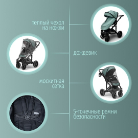 - Всесезонная защита: Удлиненный капюшон с дополнительной секцией, солнцезащитным козырьком, москитной сеткой, дождевиком и утепленным чехлом на ножки.