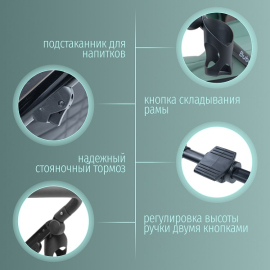 - Комплектация: подстаканник, чехол на ножки, москитная сетка, дождевик, рюкзак, муфта.