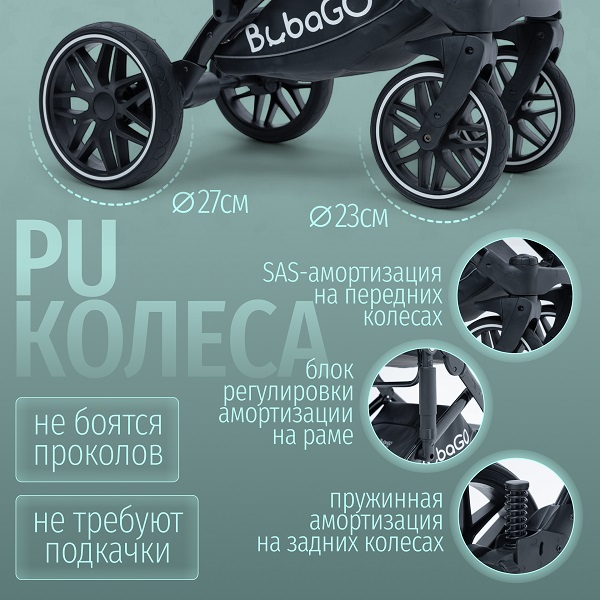 - Плавный ход: Полнопружинная независимая амортизация всех колес, SAS-система и большие PU колеса для уверенного движения по асфальту, плитке, грунту и снегу.