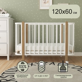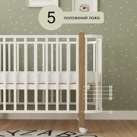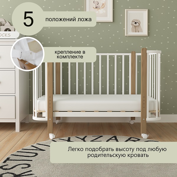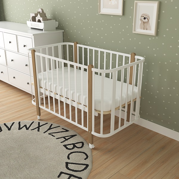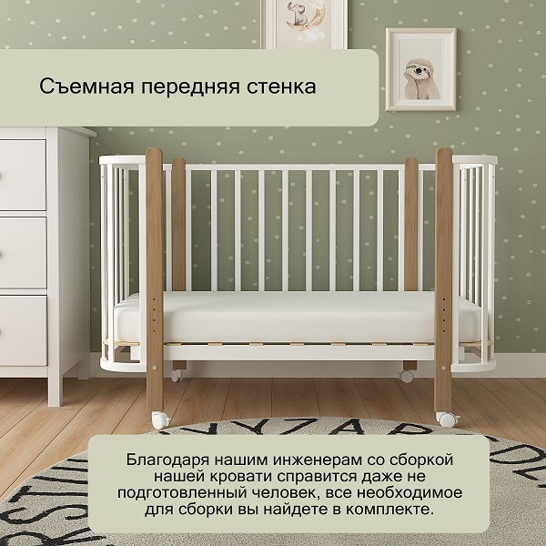 - Съемная передняя боковина для возможности приставления кроватки к родительской и организации совместного сна