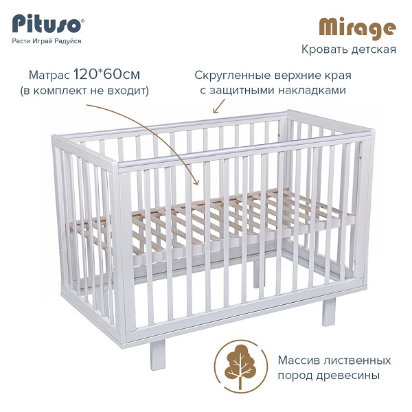 Лаконичная кроватка отличается внешней изысканной простотой, качеством, функциональностью и практичностью. Оптимальное расстояние между узкими рейками гарантирует, что ручки и ножки крохи не застрянут, а скругленные верхние края кроватки что делают кроватку удобной и безопасной во время сна, отдыха и игр. Когда малыш подрастет, кроватку можно использовать как диванчик. Подходит матрас, размер 120*60 см.