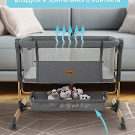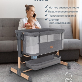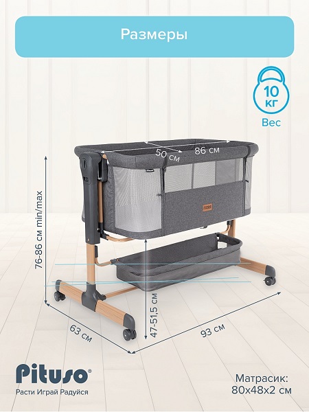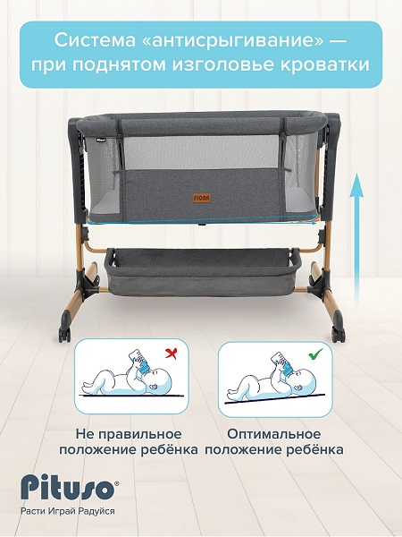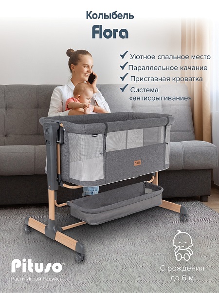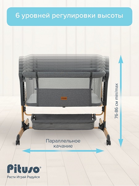 Приставная колыбель Pituso Flora имеет безопасную систему крепления к кровати родителей и позволяет вам спать рядом с малышом. Уникальная связь между малышом и родителями будет еще сильнее, а ночи – спокойнее! С колыбелью можно не беспокоиться о самочувствии младенца по ночам, ведь теперь вы сможете покормить и успокоить малыша, когда бы он ни проснулся. Также мама может приподнять изголовье ложа, что улучшит дыхание малыша во время простудных заболеваний и снизит риск срыгивания после кормления. Регулируемая высота опор дает возможность создать наклон. Колыбель оснащена специальной системой крепления, благодаря которой фиксировать ее к кровати родителей очень просто (крепится к кровати родителей с помощью ремней). Боковой бортик опускается для присоединения к кровати родителей и поднимается обратно. Прочная алюминиевая рама имеет 6 уровней регулировки высоты и усилена дополнительной защитой против случайного сложения. А кнопки с обеих сторон колыбели предотвращают случайную смену положения высоты. Колыбель можно использовать как самостоятельную детскую кроватку. Сетка по всему периметру колыбели позволяет родителям присматривать за ребенком.