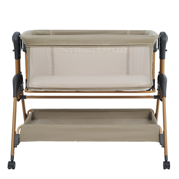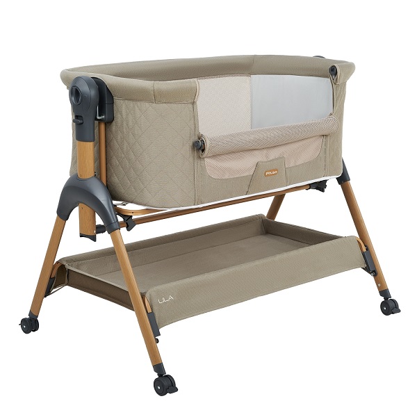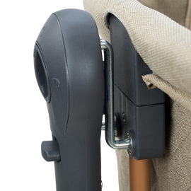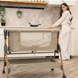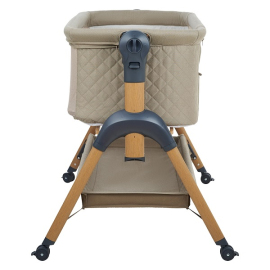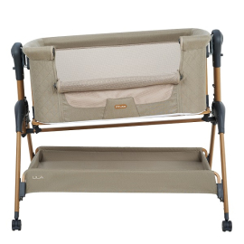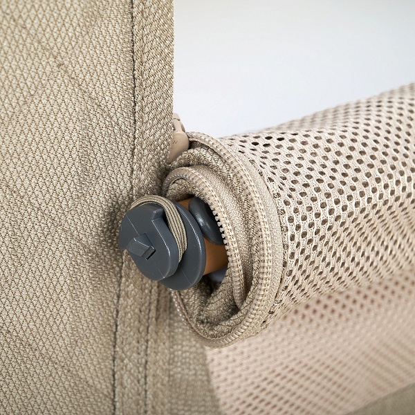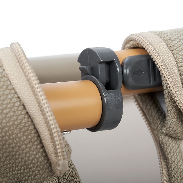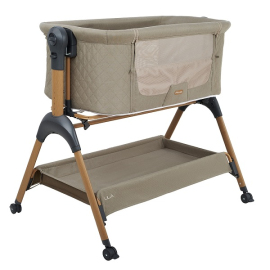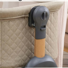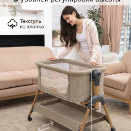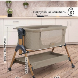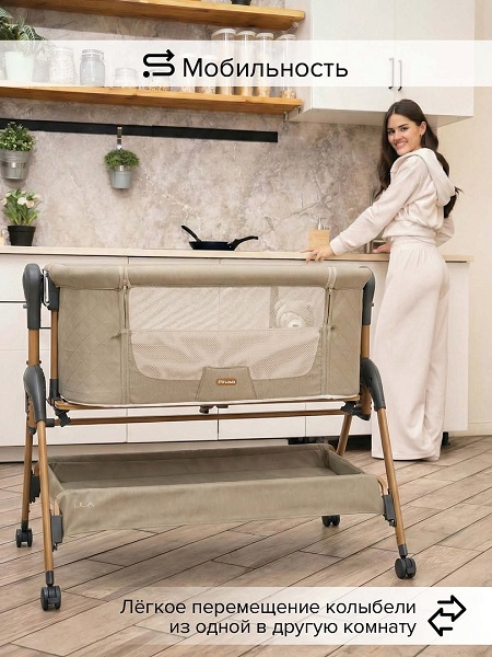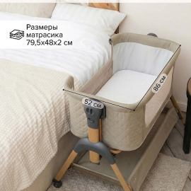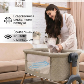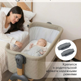 • Всегда рядом: Специальная система крепления (ремни) позволяет быстро приставить колыбель вплотную к вашей кровати. Боковой бортик опускается на молнии, создавая единое пространство.