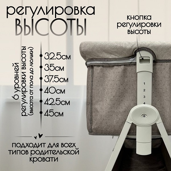 6 уровней регулировки высоты — подходит под все типы родительских кроватей.
