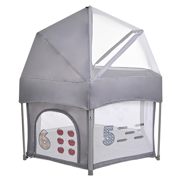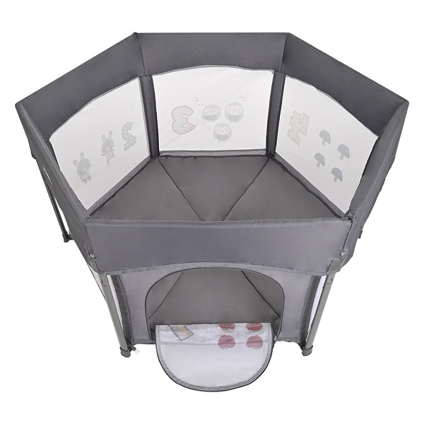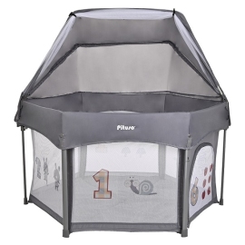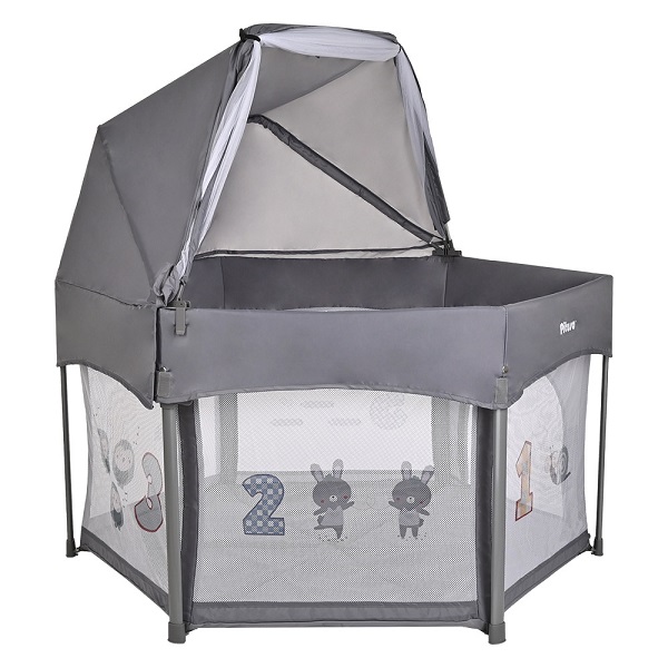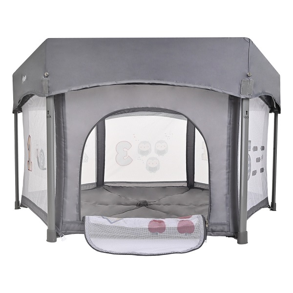 - Манеж оснащен водонепроницаемым дном и мягким матрасиком, который легко вытаскивается, а также есть съемная крыша и москитная сетка.