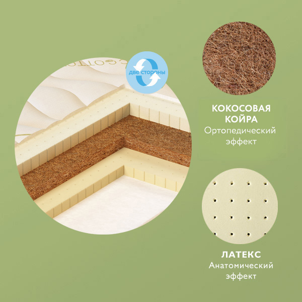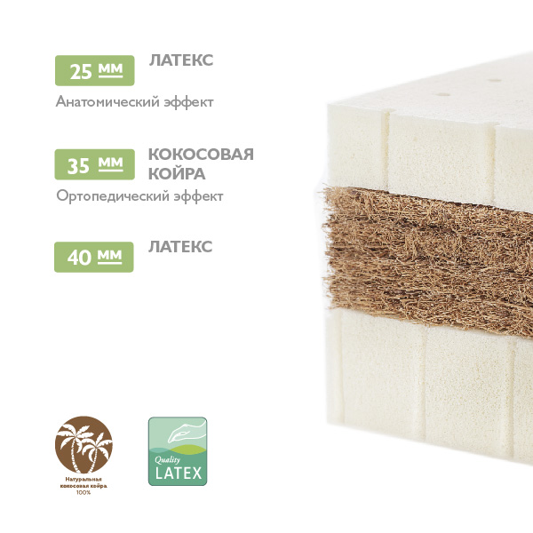 Матрас обеспечивает двойной эффект: ортопедические свойства и удобство даже для чувствительного ребенка. Двусторонняя модель: слои натурального латекса различной высоты создают разницу в соотношении плотности и эластичности. На одной стороне (латекс 25 мм) рекомендуется спать новорожденному, а вторая (латекс 40 мм), подойдет ребенку после года. Натуральная кокосовая койра(40 мм) в основании матраса гарантирует надежную поддержку тела ребенка и правильную осанка в будущем.