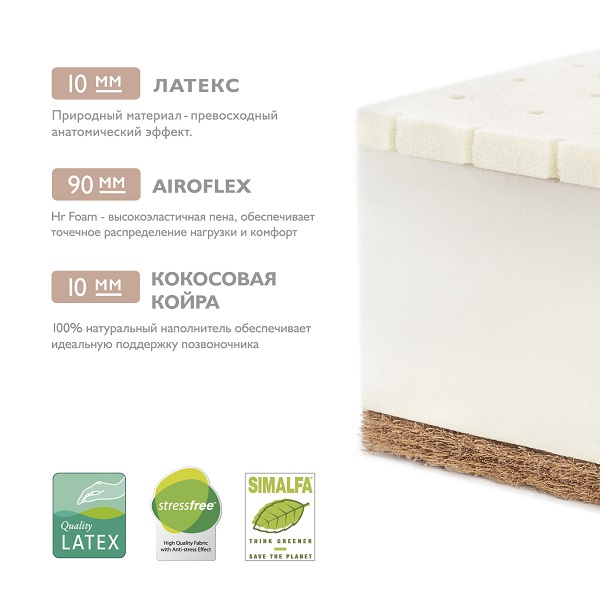 - Для удобства слои наполнителей соединены между собой — экологичным составом на водной основе, он не имеет цвета и запаха и абсолютно безопасен для ребенка (SIMALFA, Швейцария).
