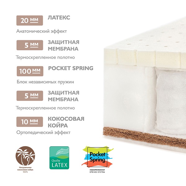 - Кокосовая койра с другой стороны (10 мм) — сторона для профилактики деформаций позвоночника. Натуральная кокосовая койра, скрепленная латексом, гарантирует ровную плотную поверхность для сна. Материал известен своими ортопедическими свойствами и неприхотливостью.