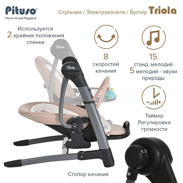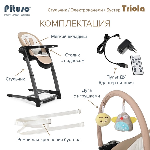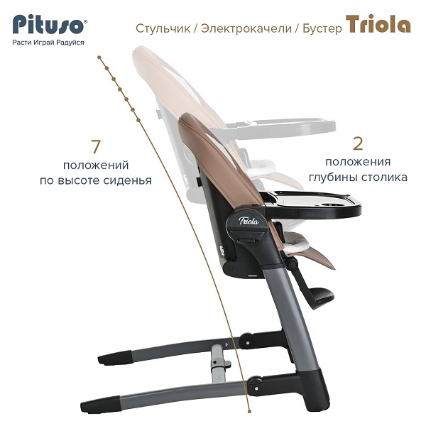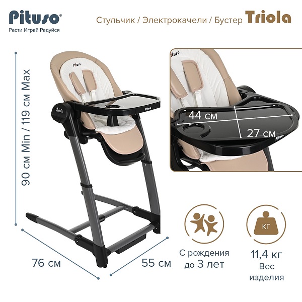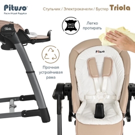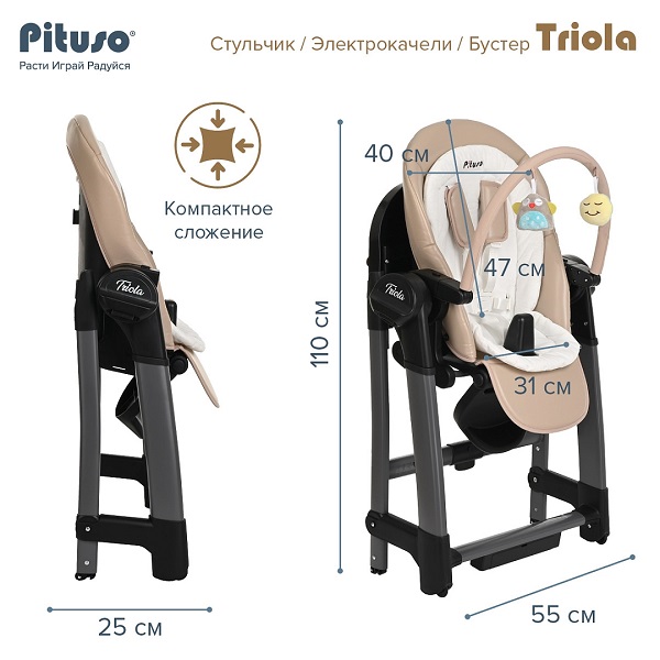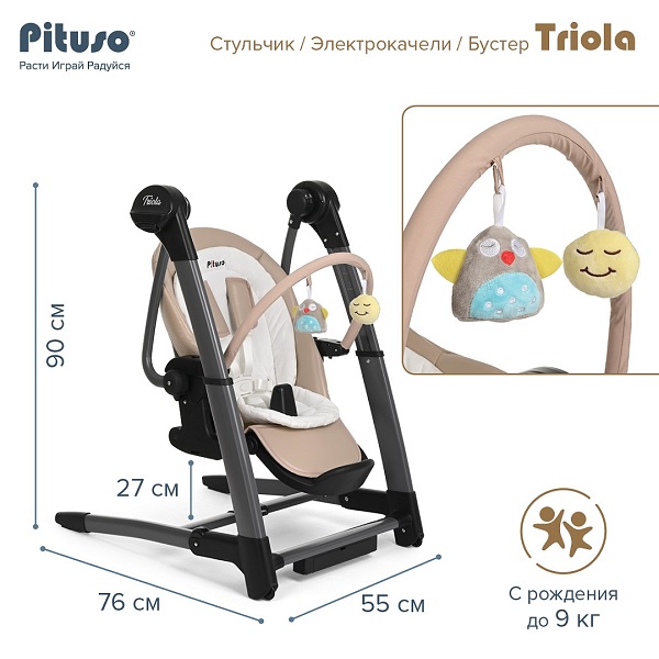 Pituso Triola - уникальный предмет мебели для ребенка с рождения, сочетающий в себе три варианта использования: электрокачели, стульчик для кормления и бустер.